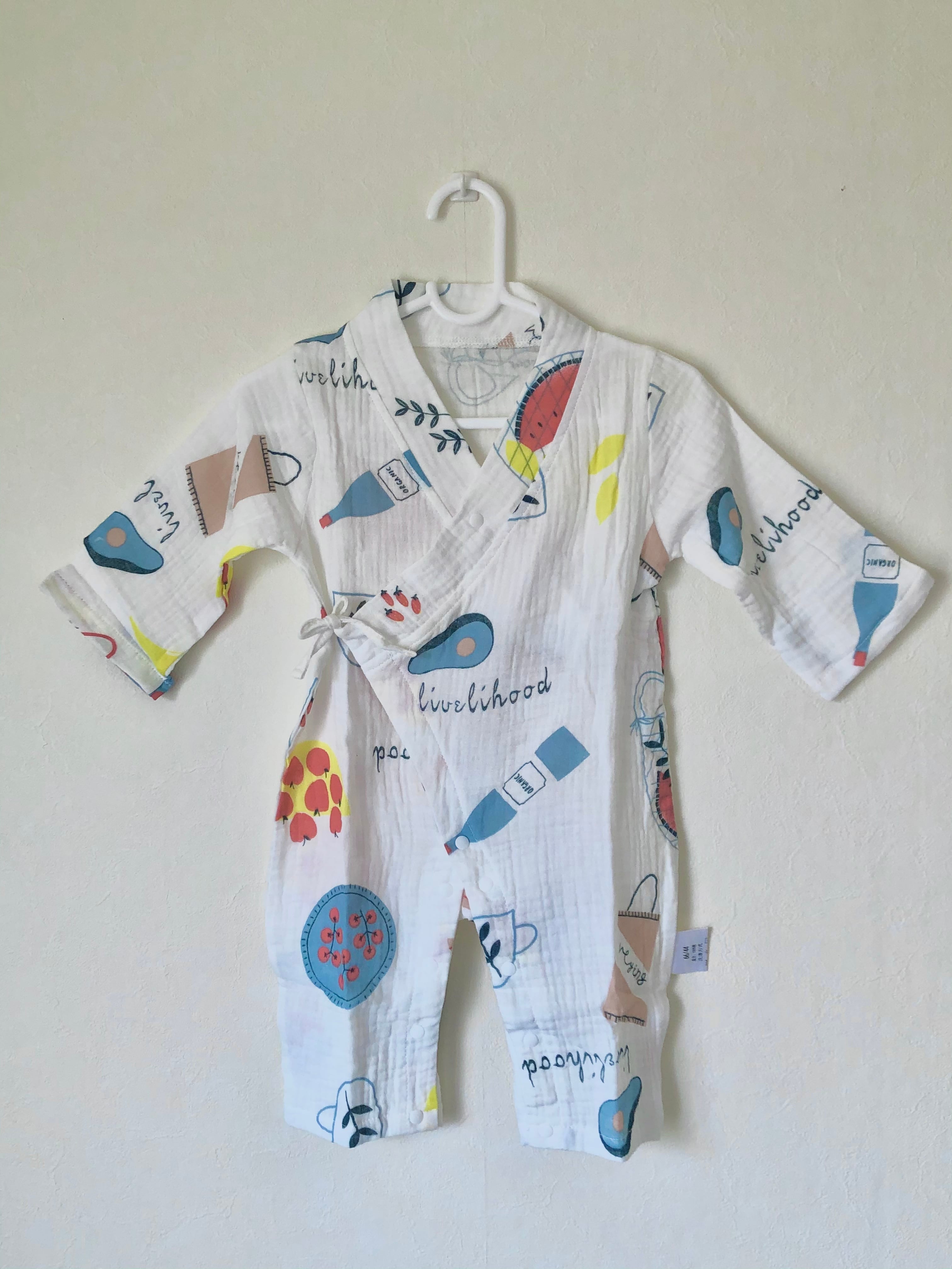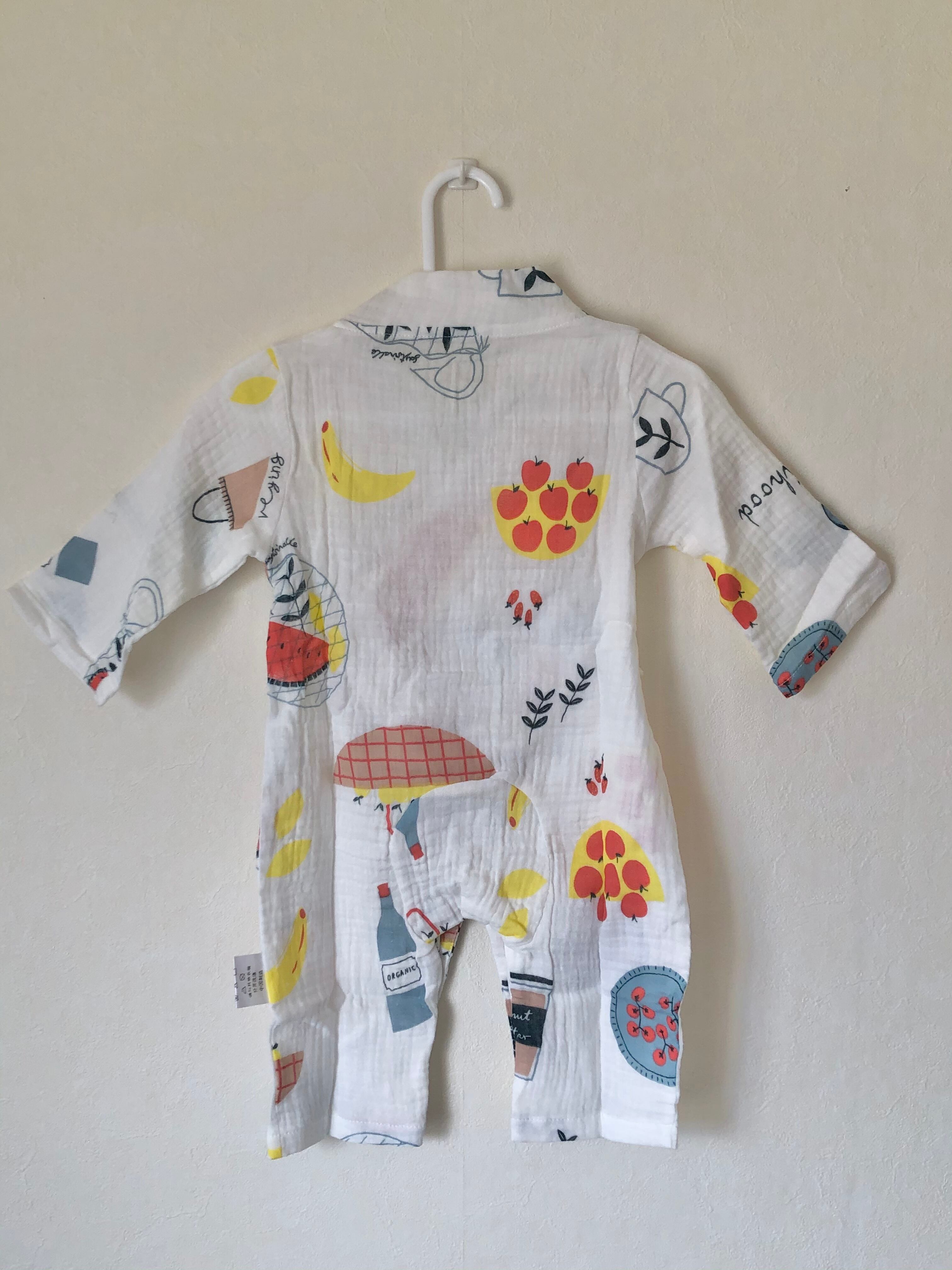 柔らかいガーゼ素材の、パターン入りロンパース。