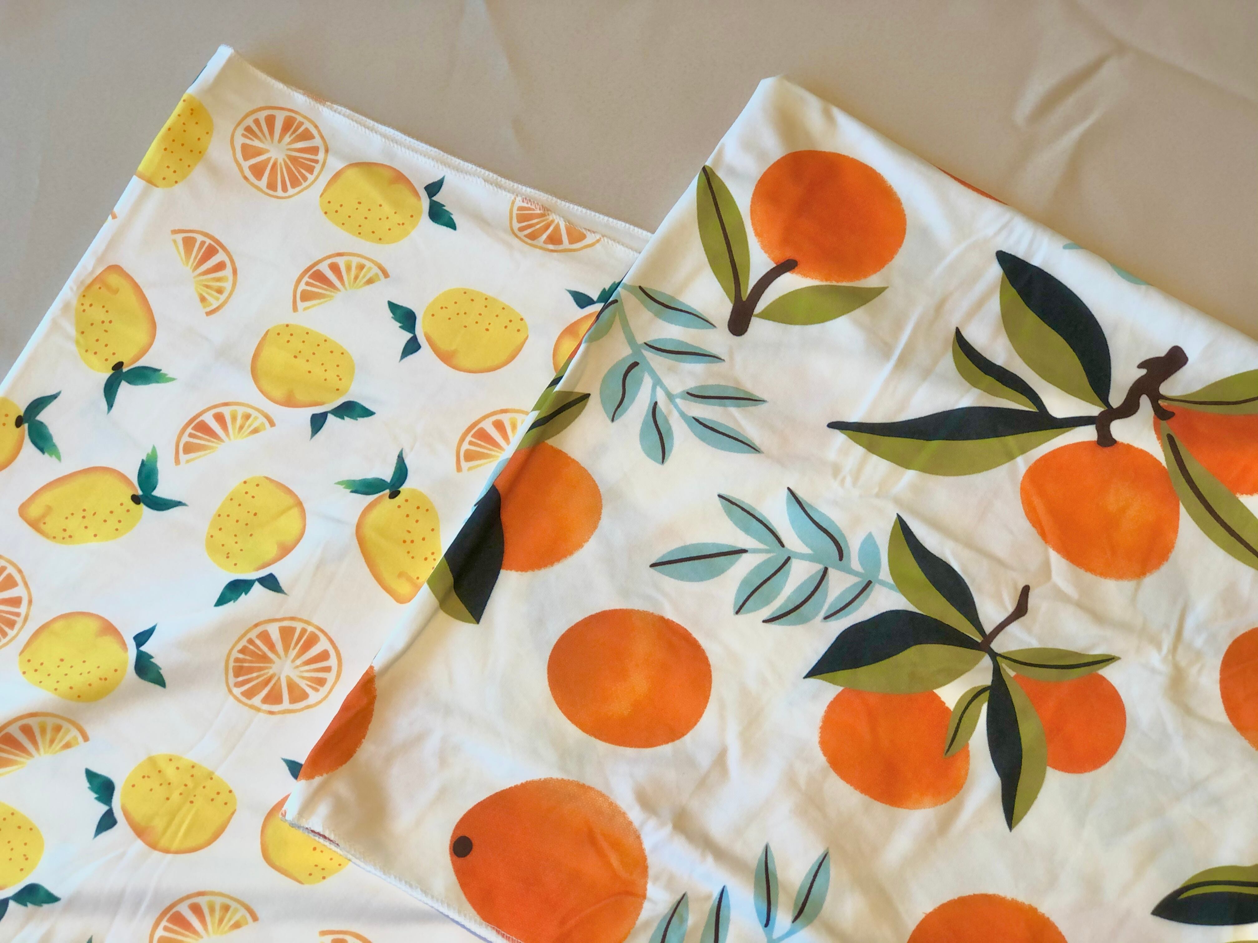 オレンジ柄のおくるみになります。柔らかい素材の為、肌触りもいいです。