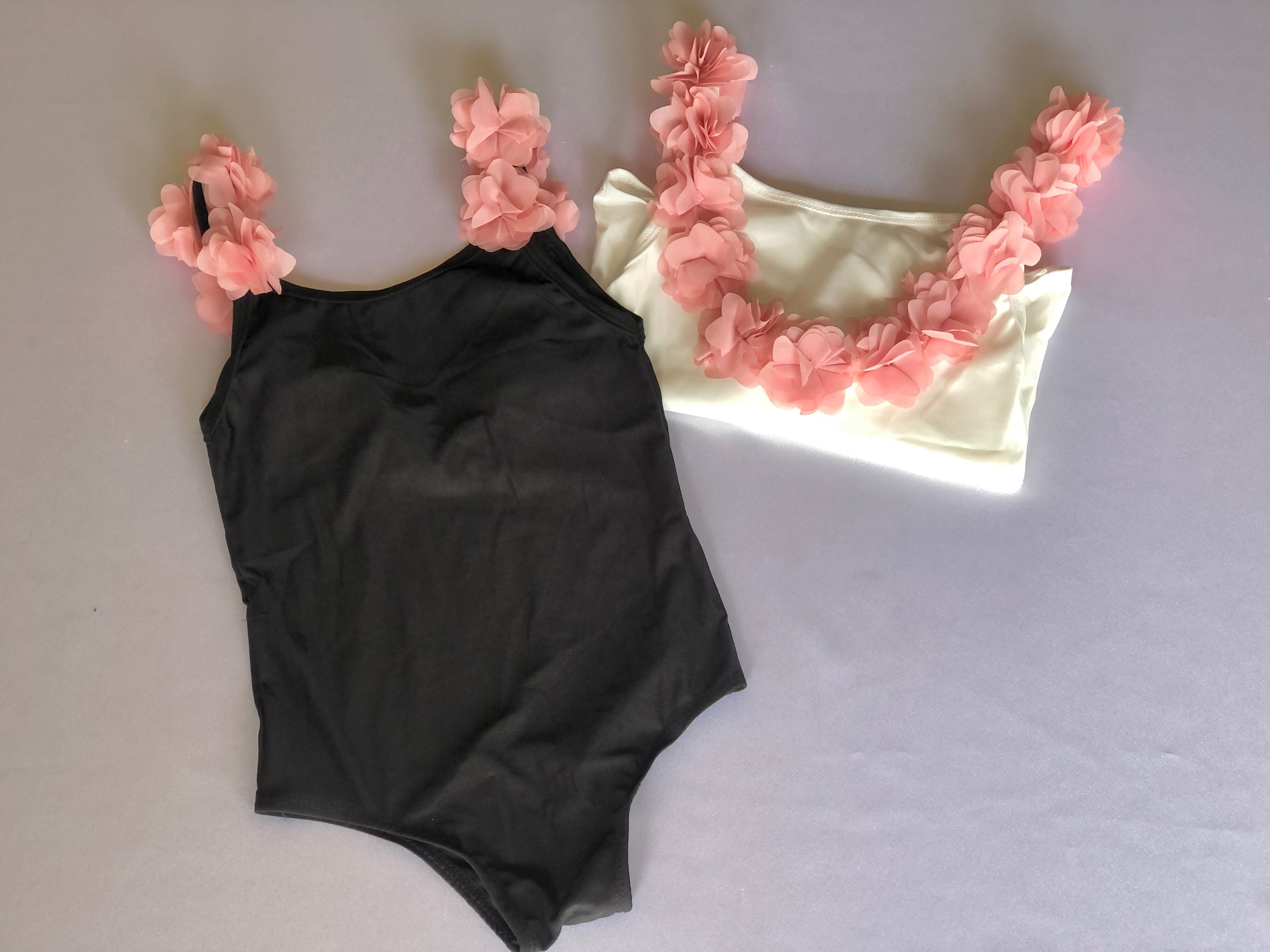 ピンクのお花があしらわれた、ベビー水着になります。