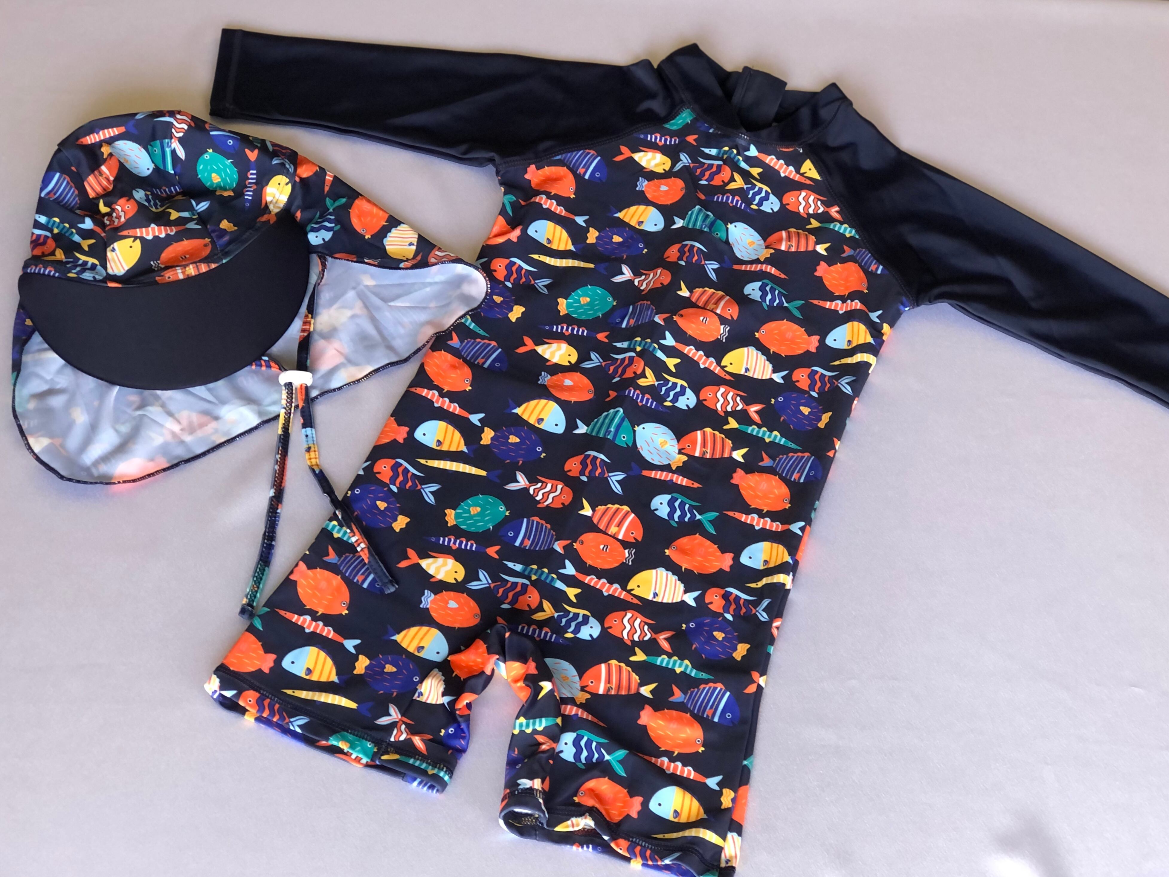 カラフルなお魚のデザインがポイントで、同じ柄のスイムハットもセットになります。