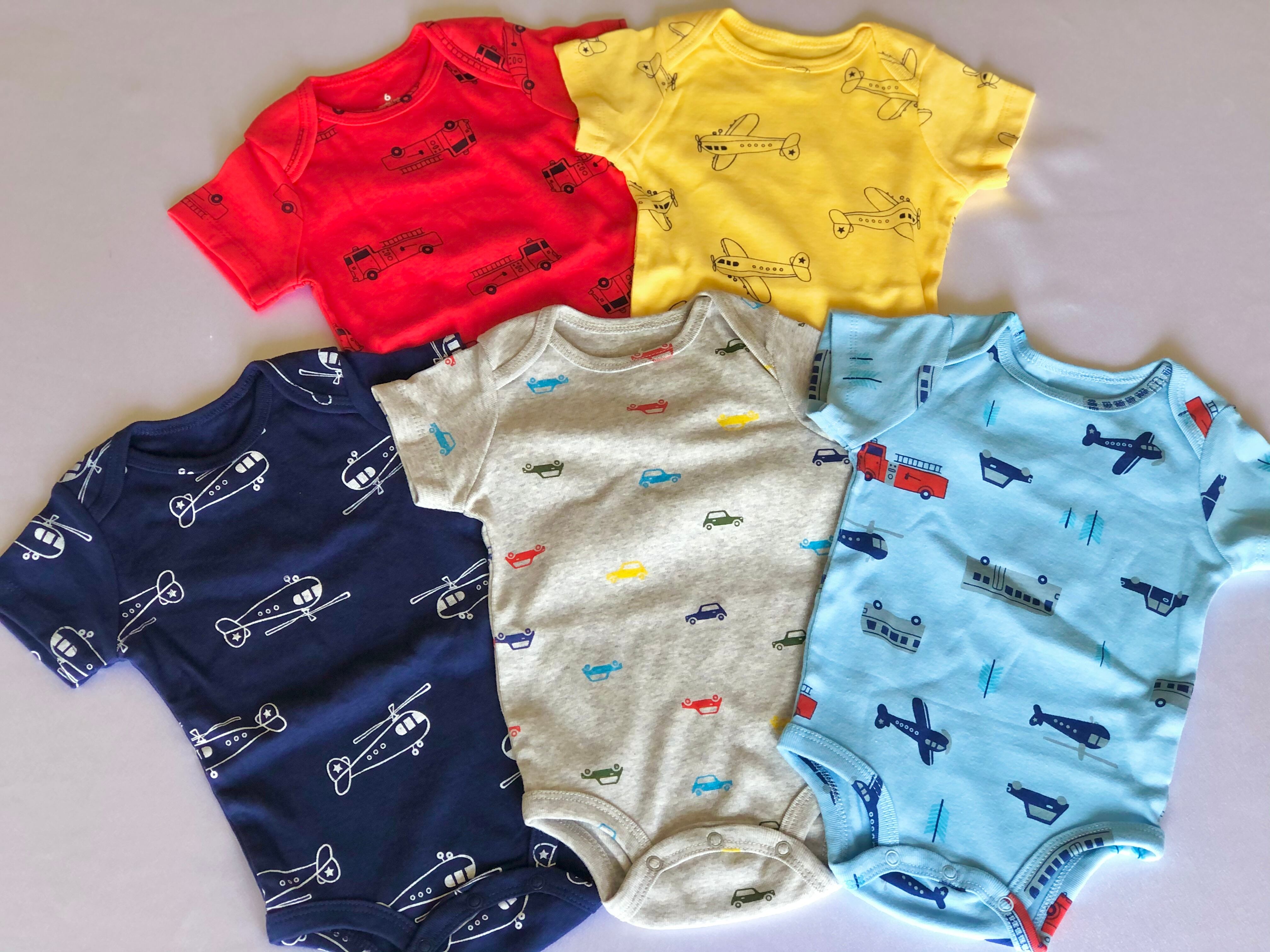 車や飛行機などの乗り物がプリントされた、ロンパースになります。