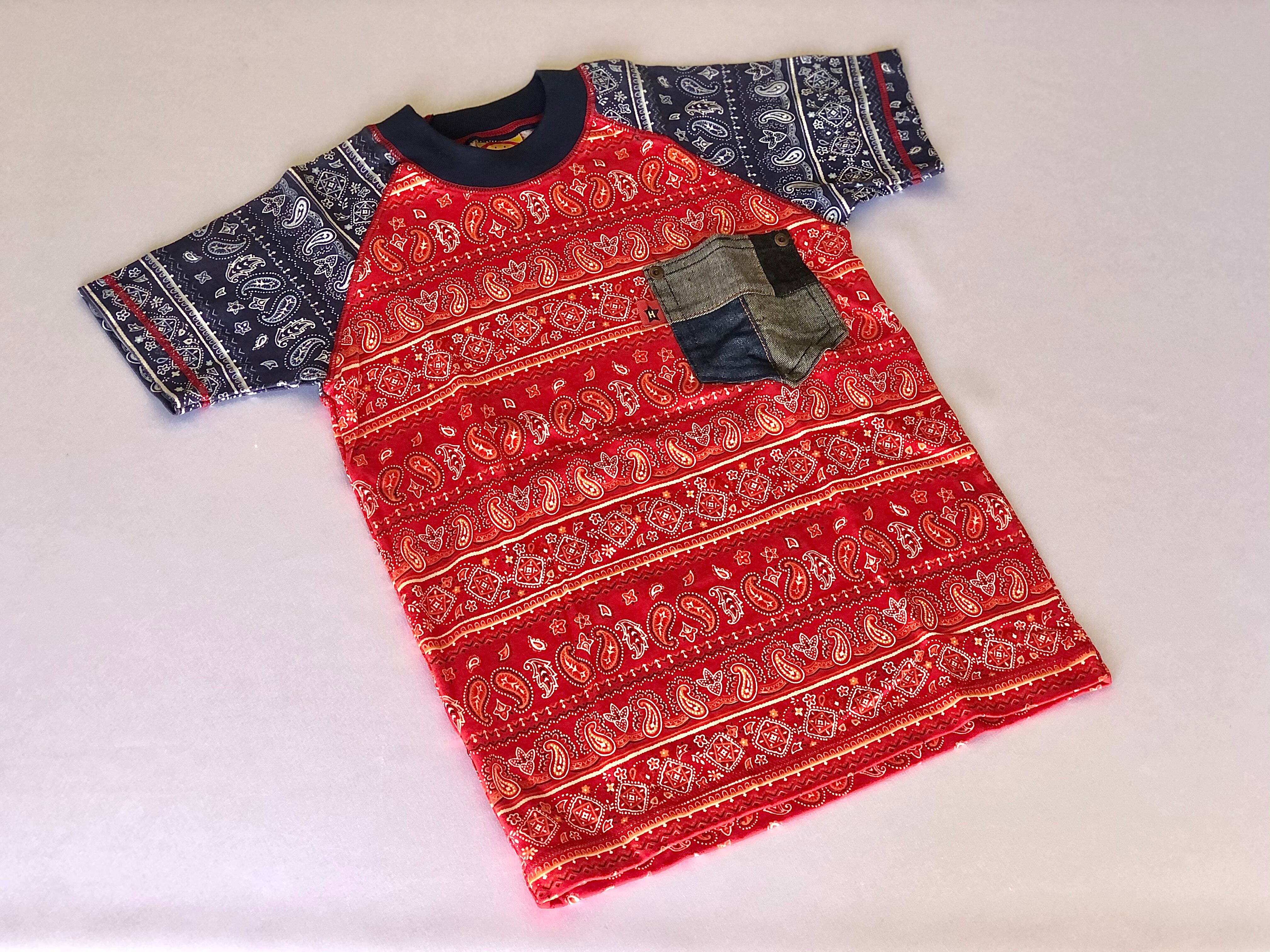 ネイビーとレットのペイズリーが、パッチワークになっており胸ポケットはデニム生地と